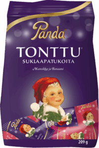 Ihanan pehmeät vaahtonougatpatukat on maustettu mansikalla ja banaanilla ja päällystetty maitosuklaalla. Panda Tonttu suklaapatukka on pikkutonttujen ehdoton suosikki!