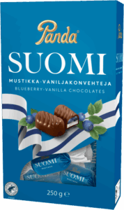 Suomi Mustikka-Vanilja tarjoaa perinteisen Suomi -konvehdin rinnalla sinivalkoisia makuelämyksiä suklaan sekä perinnemarjan, mustikan ystäville.