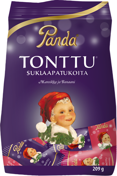 Ihanan pehmeät vaahtonougatpatukat on maustettu mansikalla ja banaanilla ja päällystetty maitosuklaalla. Panda Tonttu suklaapatukka on pikkutonttujen ehdoton suosikki! –